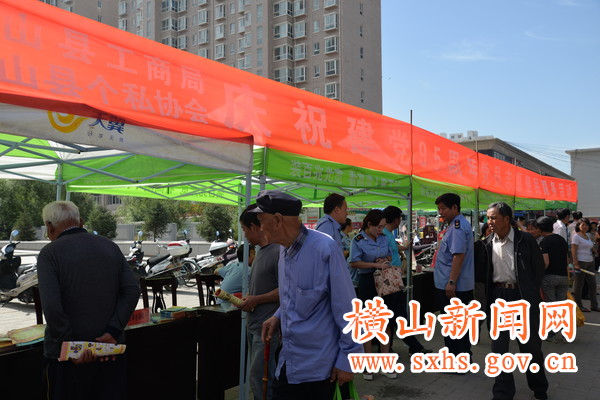 6月30日,横山县工商局、横山县个私协会在县城中心广场举行庆祝建党95周年党员志愿便民服务,来自榆林北方医院、横山县电信公司、横山县增前天然气有限责任公司、上海视光配镜中心、贾珊剪烫名店等企业、个体部分党员和党员积极分子开展了义诊、法律、安全咨询服务、配镜、理发等便民服务活动。