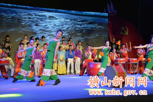 演出在一曲《南湖红船》歌伴舞中缓缓拉开序幕,台上演员的倾情表演与背景屏幕的交互渲染,让全场观众重温和见证了1921年7月“南湖画舫”所开辟的伟大与神圣。随后,无论是《破晓曙光》的深情朗诵,还是《翻身记》的说书诉唱;无论是庄严的入党宣誓,还是欢腾的陕北秧歌;无论是地方民歌大联唱,还是爱国歌曲大合唱;都以歌舞情景剧为主,通过特有的艺术形式歌颂了祖国、歌颂了党,全面反映了民族气节和时代精神,激发了广大党员干部群众的爱党、爱国、爱家乡热情。
