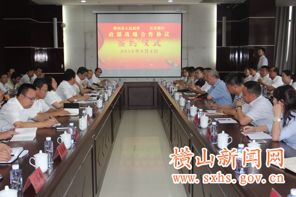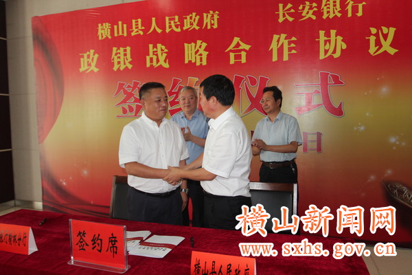 8月4日,县政府与长安银行签订政银战略合作协议。政府县长周建国和长安银行榆林分行党委书记、行长刘建芸签订《横山县人民政府与长安银行政银战略合作协议》;县卫生局负责人和长安银行横山支行行长签订《横山县社会公共服务卡(居民健康卡)项目合作协议》。长安银行总行党委委员、常务副行长黎惠民,长安银行总行公司业务部总经理牛国强出席签约仪式。政府副县长杜修洲主持签约仪式。